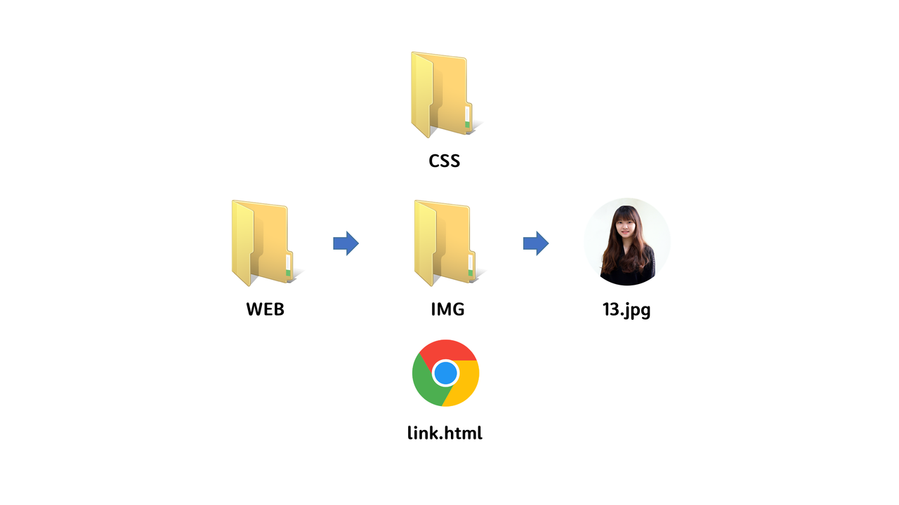以這個網頁專案來說,我在桌面上創了一個叫做WEB的資料夾,裡面有本章節的link.html,還有兩個資料夾叫CSS/IMG。 如果我要在存取IMG資料夾裡面的「13.jpg」那我可以用以下方法: